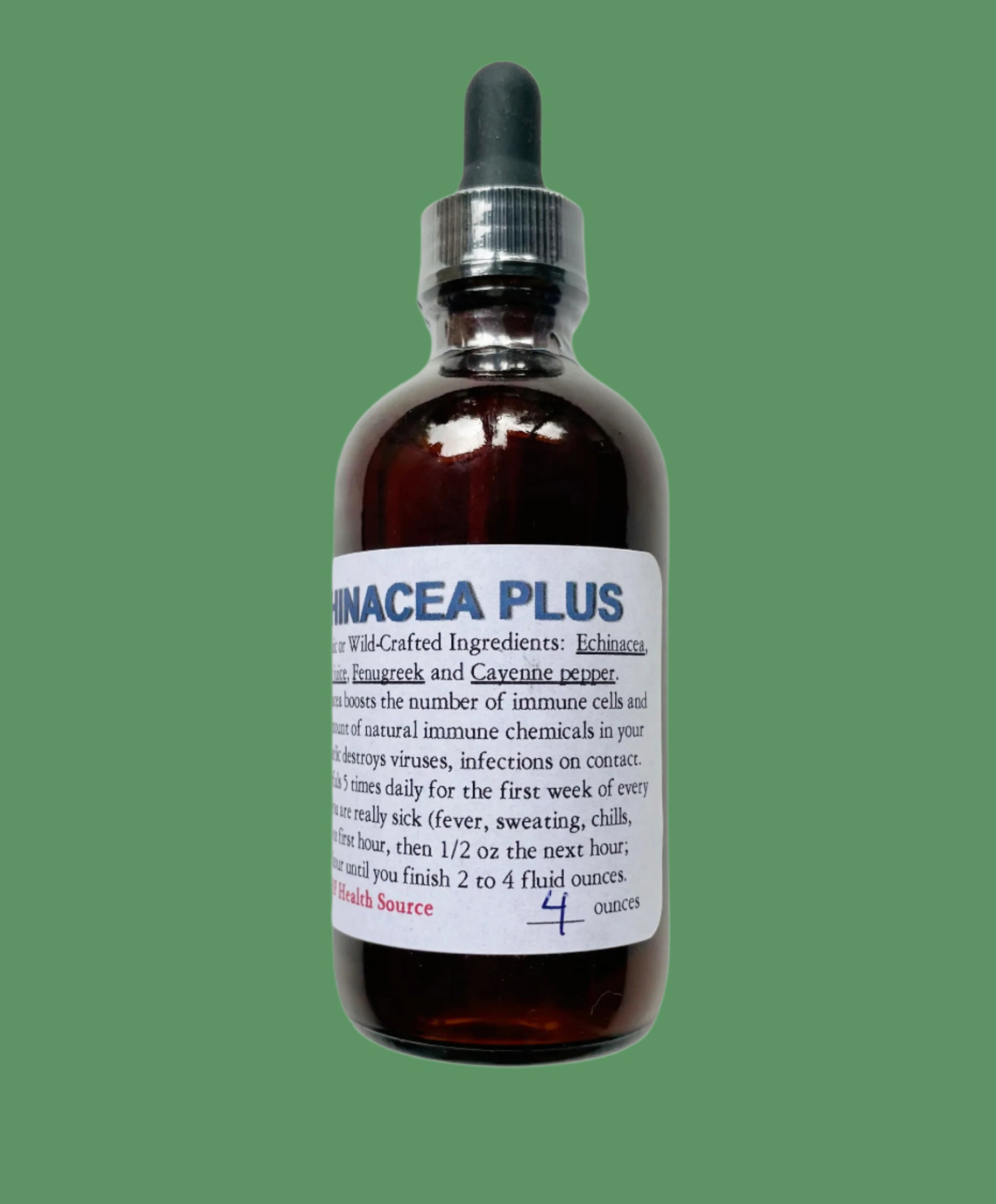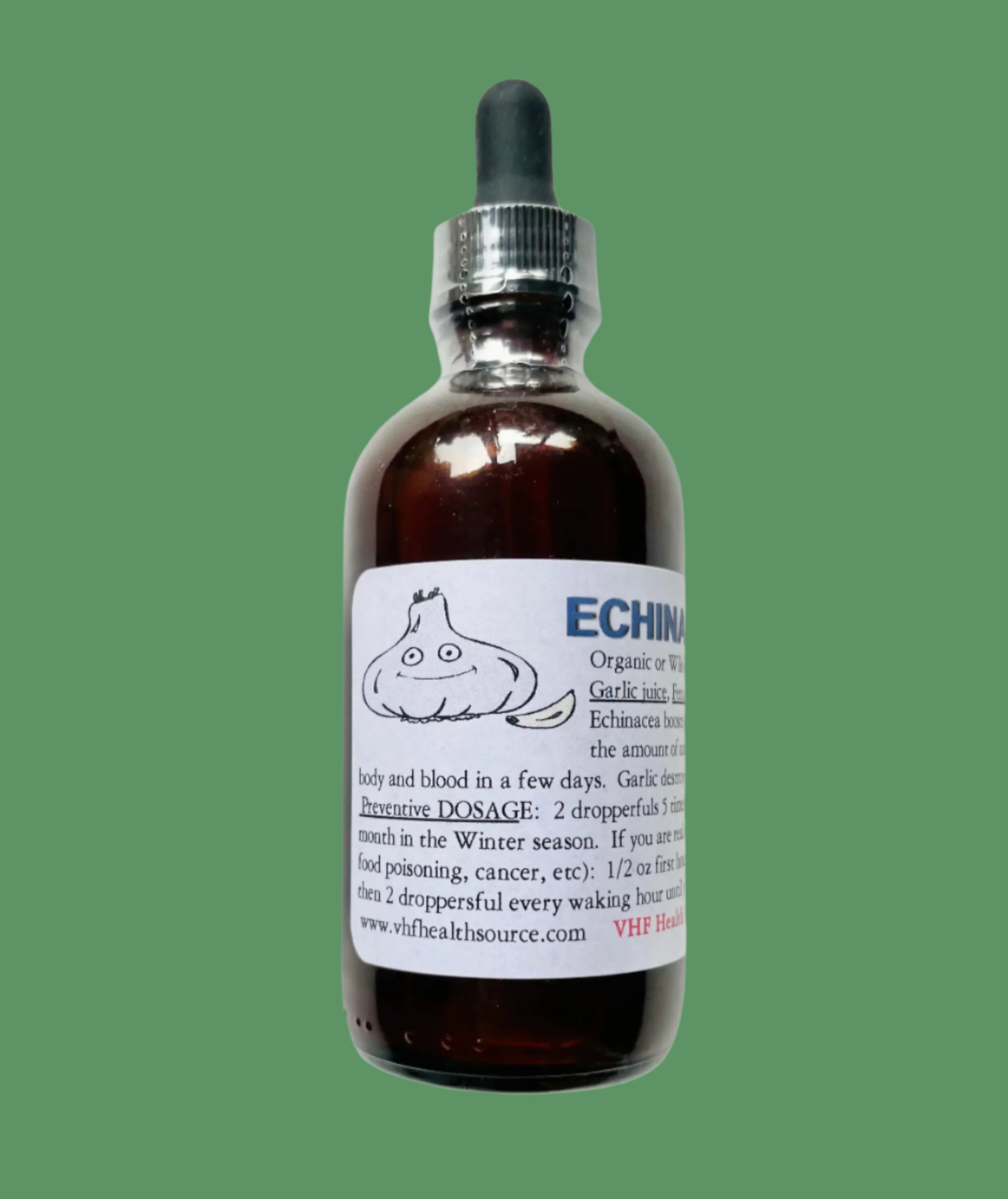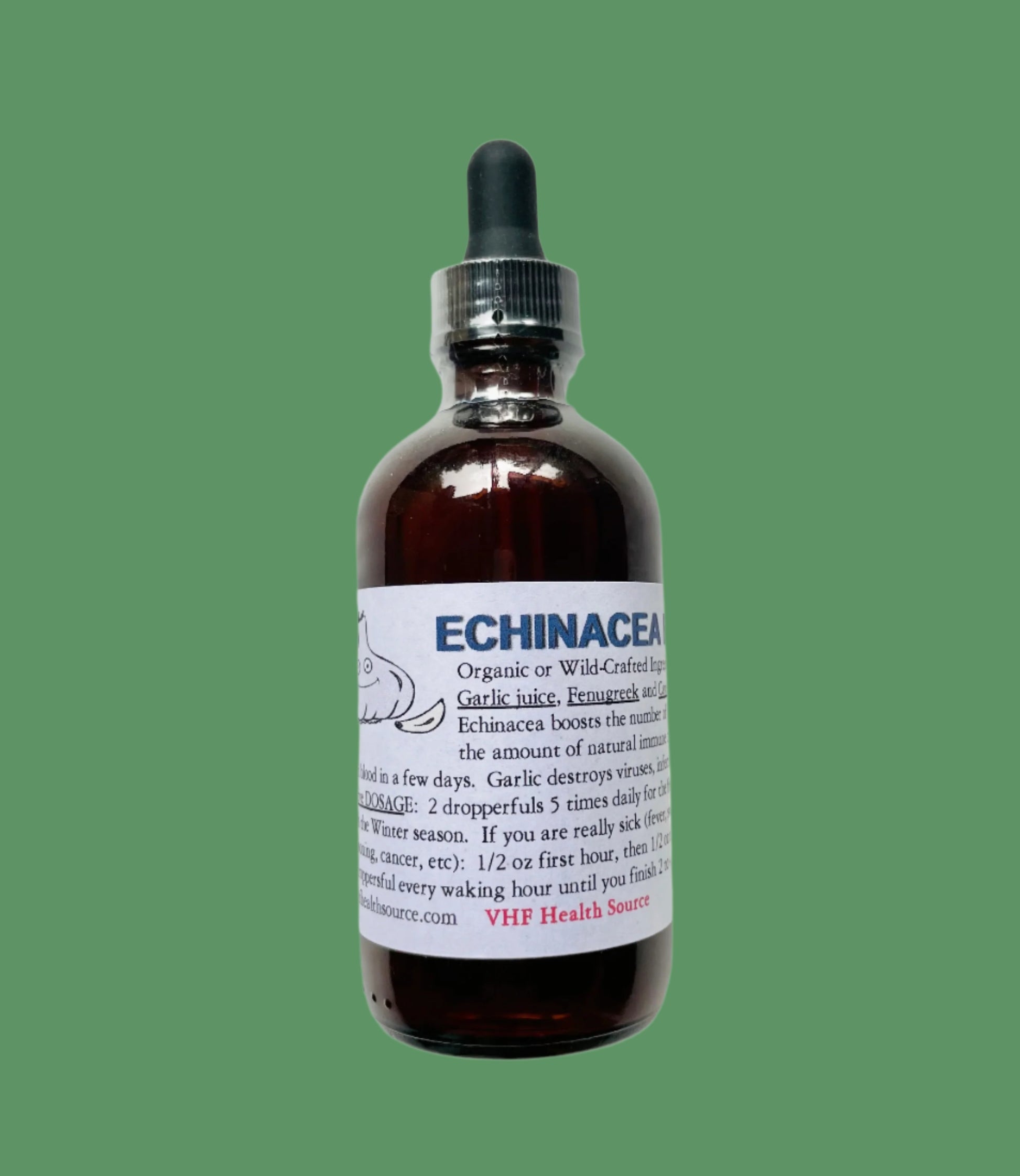 Echinacea boosts the number of immune cells and immune chemicals in your blood in a few days. Garlic destroys viruses and infections on contact. Dosage: As a preventative, take 2 dropperfuls 5x daily for the first week of every month in winter or cold/flu season. If you are already sick with fever, chills, sore throat, etc. take 1/2 oz the first hour, then 1/2 oz the second hour, then 2 dropperfuls every waking hour. Add to small amount of orange juice to help with taste. {4oz bottle with dropper}